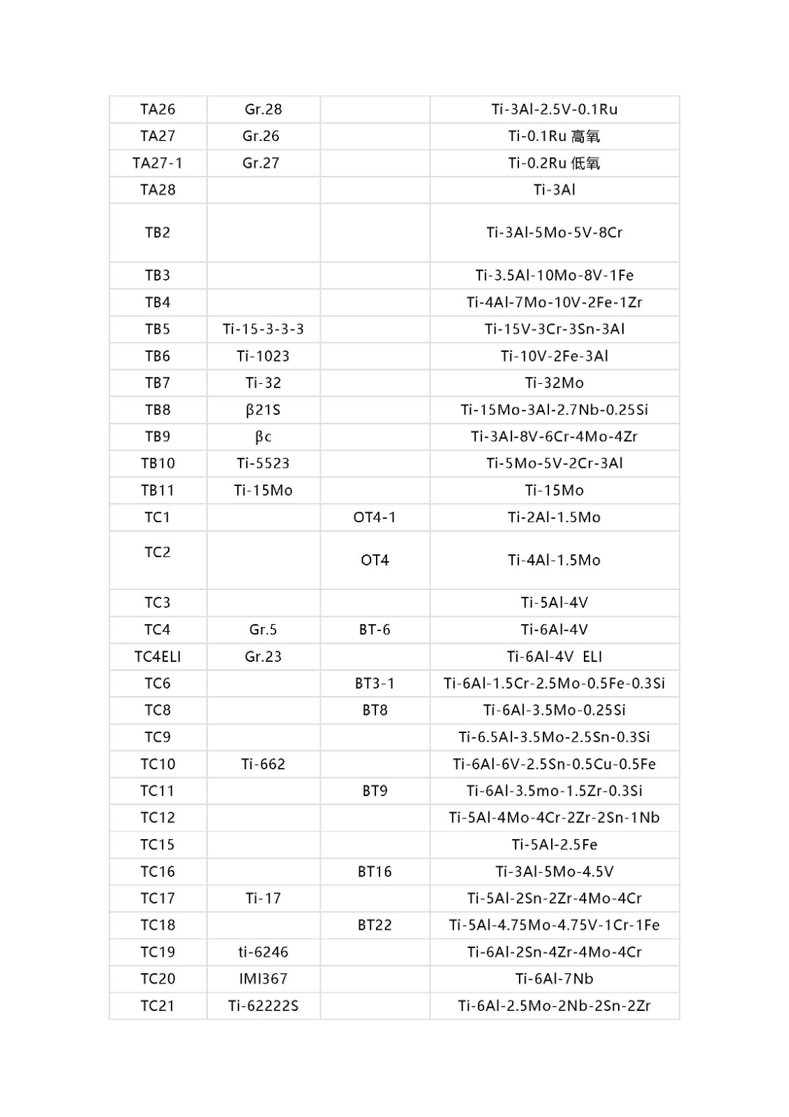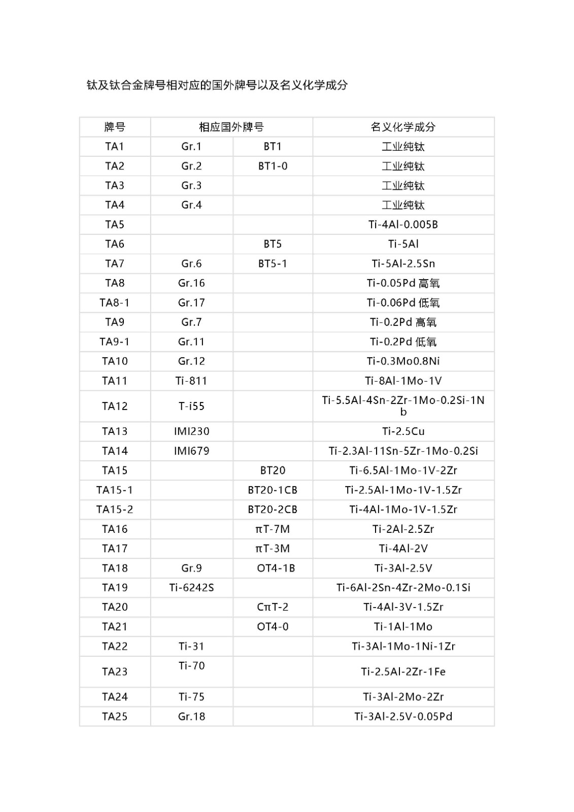 鈦及鈦合金牌號(hào)相對(duì)應(yīng)的國外牌號(hào)以及名義化學(xué)成分